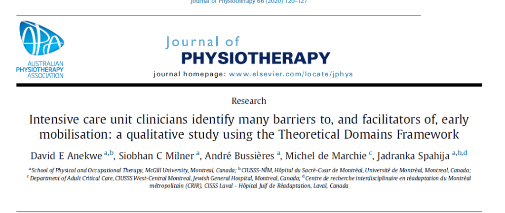 Read the full article here: Intensive care unit clinicians identify many barriers to, and facilitators of, early mobilisation: a qualitative study using the Theoretical Domains Framework.